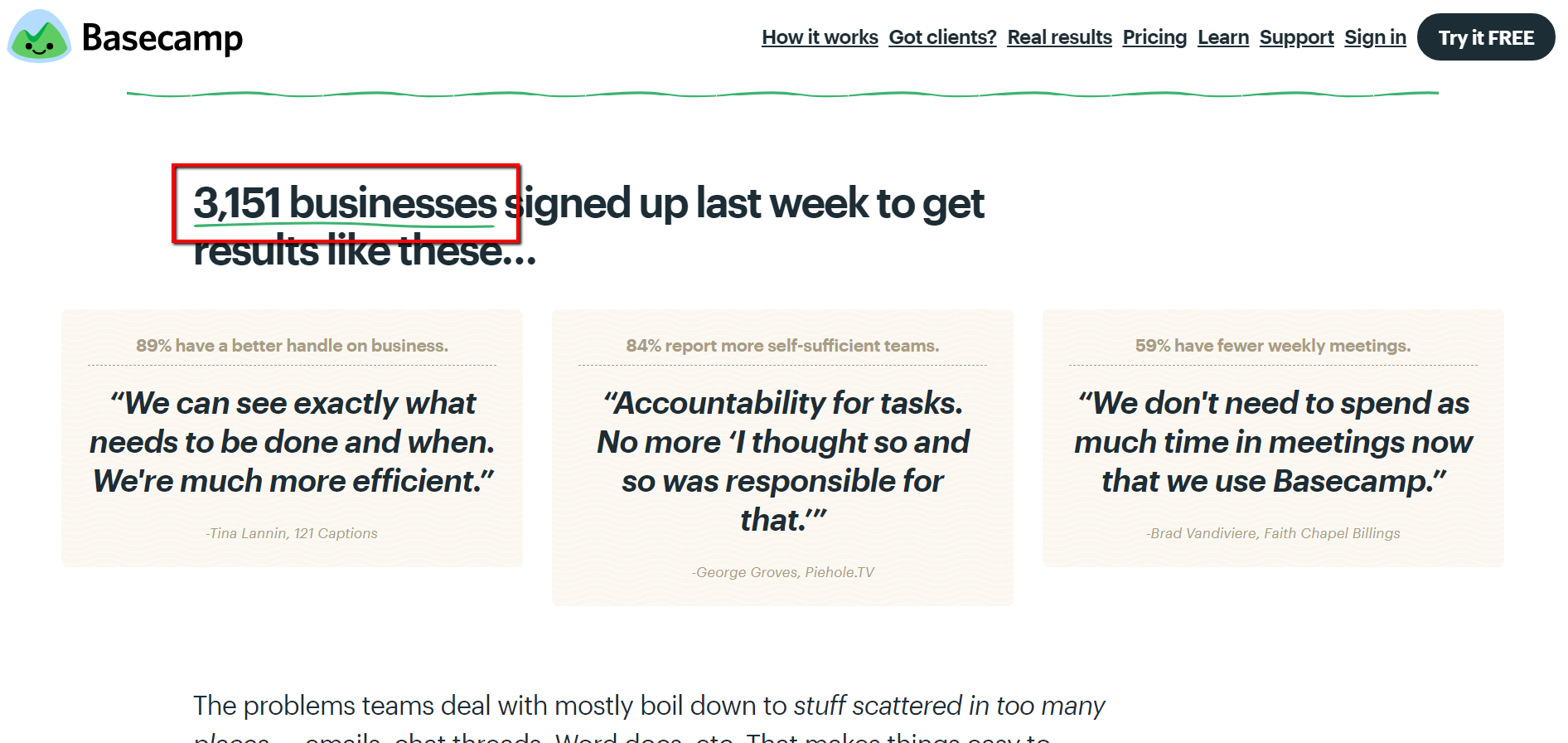 Basecamp doubles down on this concept, offering a weekly counter with testimonials and a multi-year growth chart on their homepage: